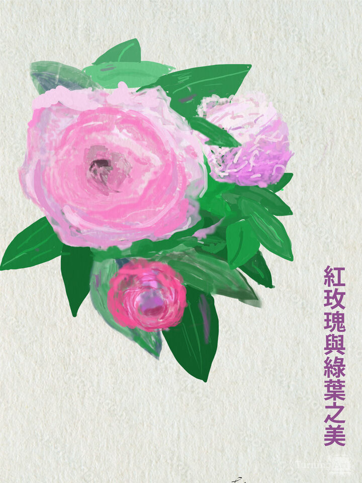 The artwork is a vibrant digital painting of three roses with lush green leaves. The largest rose, located at the top left, is a rich pink with layered petals and a purple center. Below it, a smaller pink rose with a deeper pink core contrasts against the green leaves. To the right of the large rose, there is a light purple rose in profile blending softly with the surrounding leaves. The brush strokes are bold and textured, giving the composition a lively and expressive feel. The roses are set against a creamy, textured rice paper background that enhances the colors and makes the bouquet the focal point of the piece.