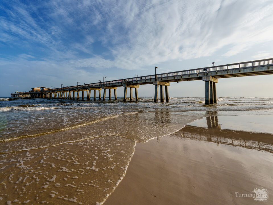 Soft evening light washes over the shoreline near Gulf State Park Pier in Gulf Shores, Alabama, USA as gentle waves roll in from the Gulf of Mexico, also referred to as the Gulf of America. The long pier stretches out into the water, while waves crash against its concrete supports. As the waves come on to the shore, the edges from into white foam swirling across the sand.