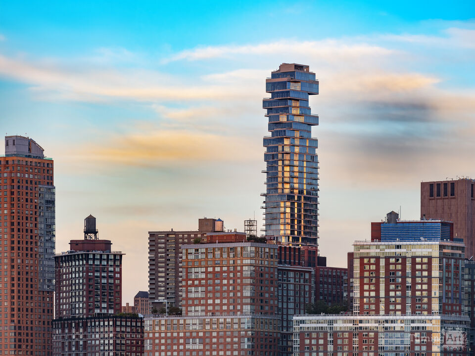 Luxury living is captured in this view of high rise apartment buildings dominating the Downtown Manhattan sky with massive scale and density, Tribeca, New York, United States