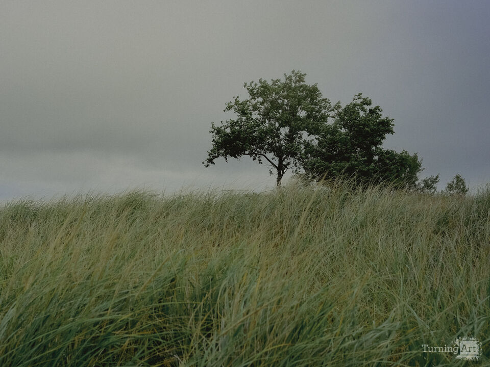 A quiet somber landscape photograph of dune grass and tree on a cloudy beach.