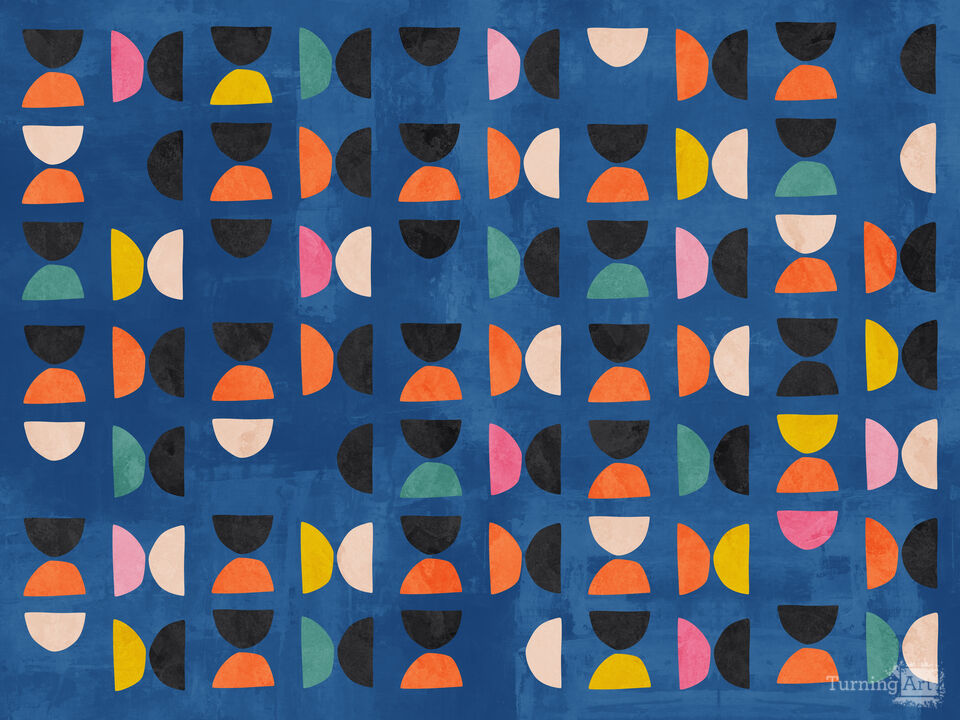 Infuse your space with a nostalgic flair through this vibrant geometric artwork. Retro-inspired shapes and bold colors create a captivating design against a deep blue background. Perfect for adding a playful and artistic touch to any room, this pattern brings a lively energy that complements both modern and classic decor styles. Let these eye-catching motifs transform your living space into a visually dynamic environment, inviting creativity and style into your home.