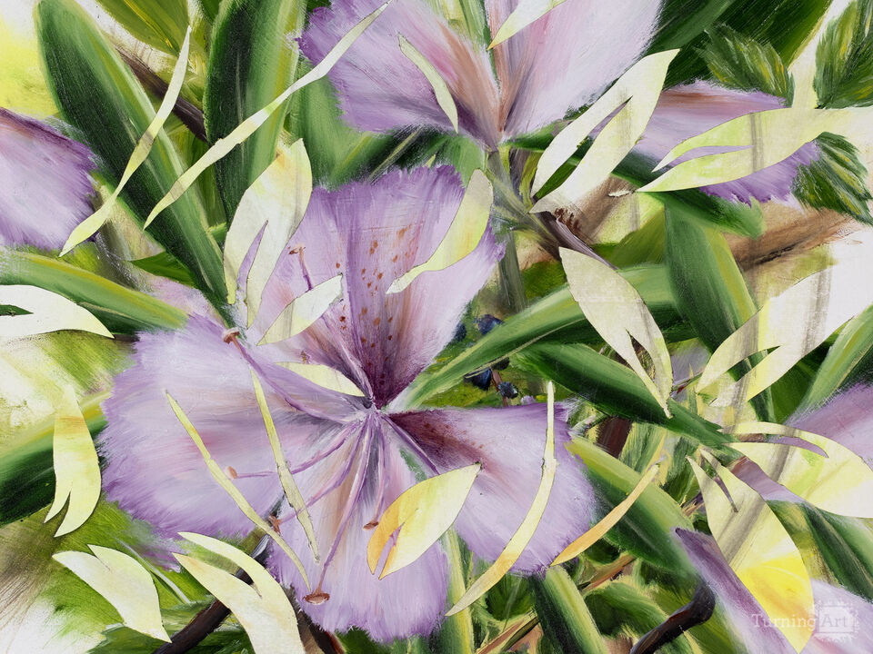 This painting portrays tangles of rhododendron leaves in an abstract collage. Referenced from Point Defiance Park Rhododendron Trail in Tacoma, WA. Also shown are hints of evergreen huckleberry.