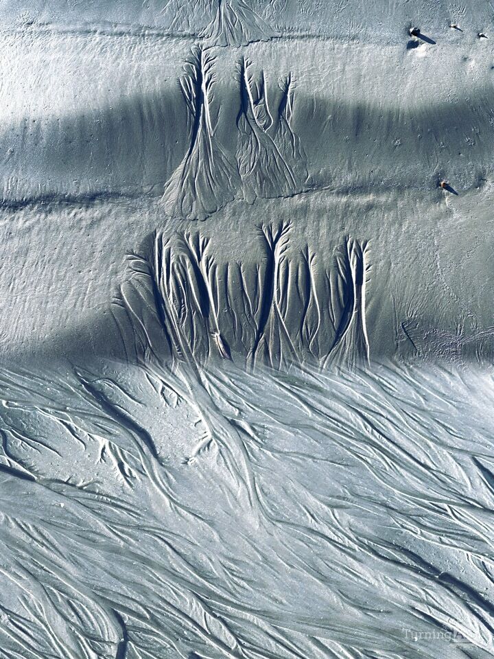 A blend of "rill" in beach sand, formed by the streaming flow of the tide. These ubiquitous dendrite formations are nature's fractal art, and expressions of self similarity that are even present in fluid dynamics.