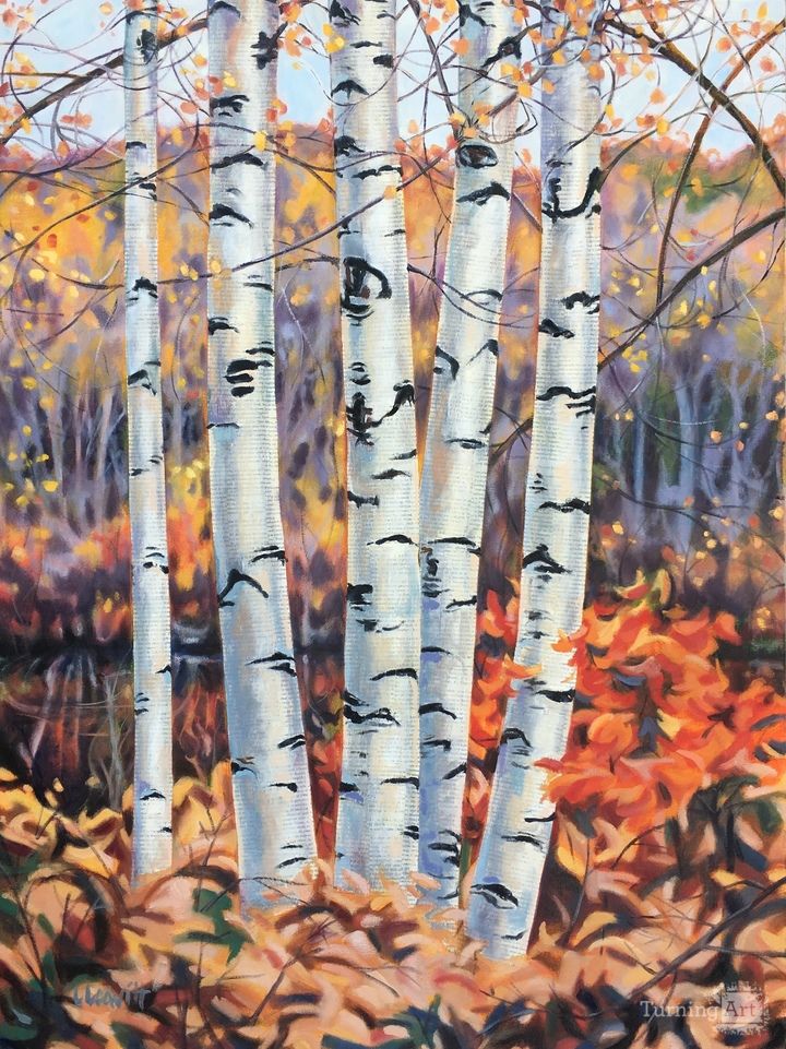 I discovered these stark white birch trees on a fall day by the side of the river. The contrast between the colorful foliage and the white birches was inspiring. I decided to add texture by collaging the tree trunks over my warm underpainting. There were many areas to let the oranges and yellows show through in the final work.