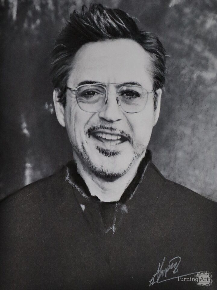 This black-and-white pastel drawing of Robert Downey Jr. captures the actor's signature charisma and intensity with striking detail. The shading is soft yet dynamic, highlighting the contours of his face, from his expressive eyes to his slight, knowing smile. The delicate gradation of light and dark tones gives the portrait a timeless quality, evoking both a sense of realism and artistic abstraction. The artist expertly uses the pastel medium to blend shadows and highlights, emphasizing Downey's sharp features while maintaining a fluid, almost ethereal texture. The composition, while focused on his face, allows for a subtle background that suggests depth without distracting from the subject. The result is a captivating, emotive rendering that showcases the actor's magnetic presence, offering a new, artistic perspective on his well-known likeness.