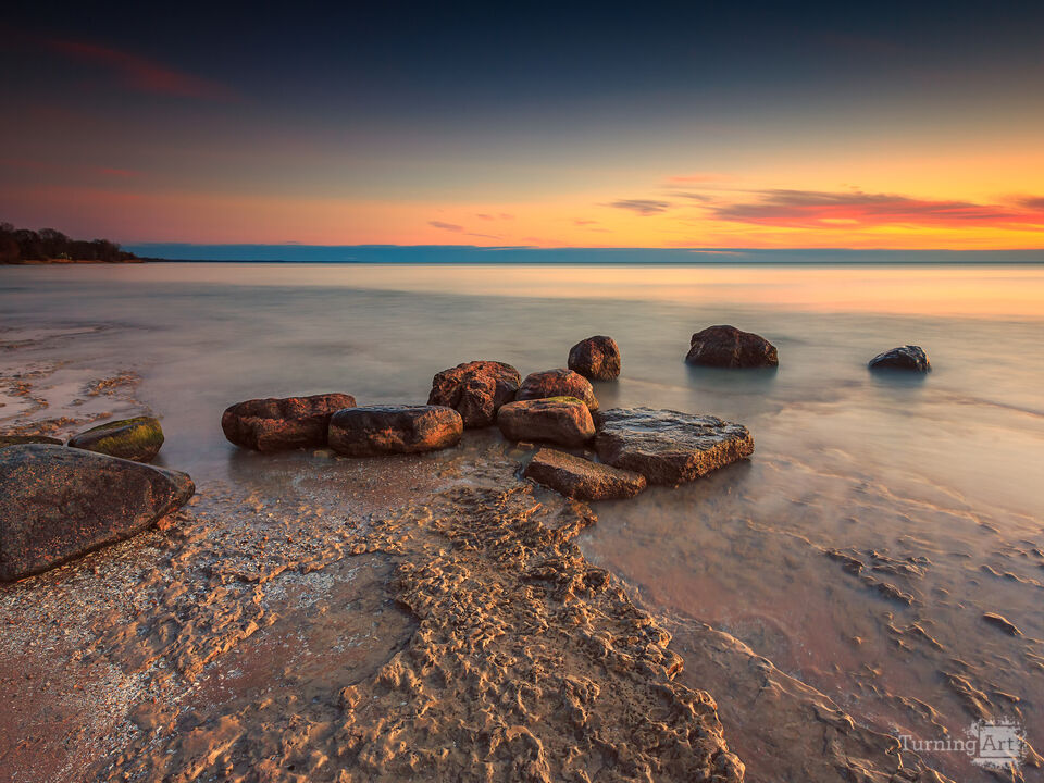 A scenic lakeside shoreline with smooth pebbles rests beneath a vibrant morning sky at Harrington Beach State Park in Belgium, WI. The peaceful Lake Michigan glistens with the colorful glow of dawn.
