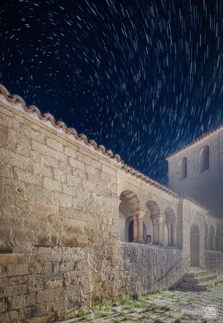 This long-exposure night photograph captures the mesmerizing circular motion of star trails above a Romanesque church. The ancient stone walls and semi-circular arches evoke medieval architecture, standing timeless beneath the rotating heavens. A visual dialogue between earth and sky, permanence and motion.