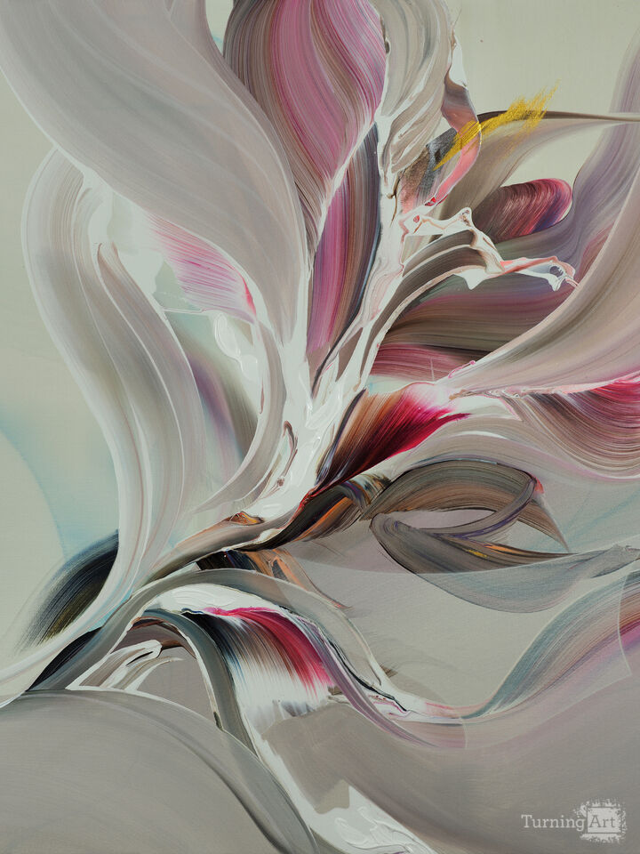 Petal-like forms rise and unfurl in a hushed rhythm, as if color itself were singing. Balancing delicacy and strength, the painting becomes a visual aria.