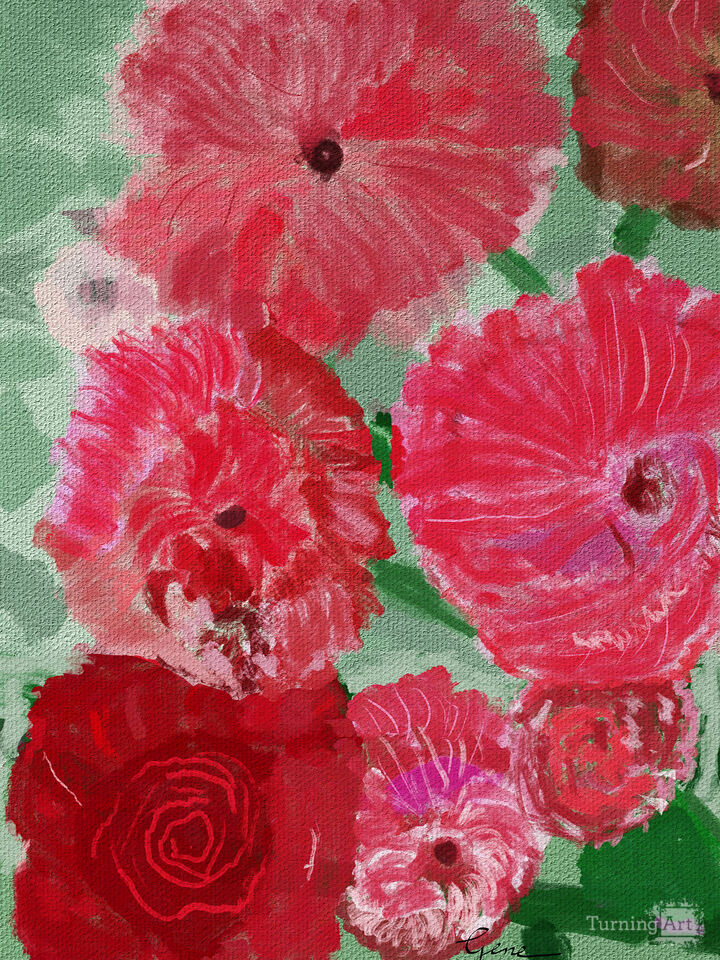 This floral painting presents a compelling visual experience through its bold, expressive use of color and gesture. The choice to focus on large blossoms in variations of red and pink is immediately impactful, evoking a sense of vibrancy and lushness. The way the artist has rendered the flowers—using loose, painterly brushstrokes—infuses the piece with movement and a sense of spontaneity. Each petal feels alive, almost fluttering on the canvas, as the tonal shifts from deep crimson to gentle blush allow for a captivating depth and dimensionality. This dynamic handling of color and texture draws the viewer’s eye across the arrangement, encouraging close inspection of the painterly techniques at play.