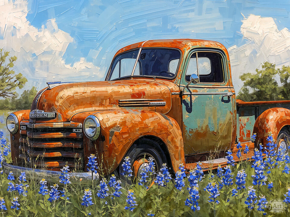 An old orange truck rests amid vibrant wildflowers under a clear blue sky. Its rusty texture contrasts beautifully with the colorful surroundings. Created with AI plus other digital editing in an impressionist painting style.