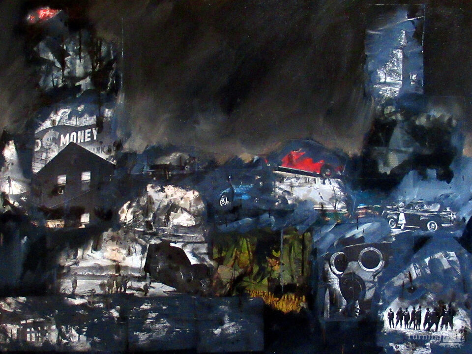 I have always been inspired by GOYA'S BLACK PAINTINGS and RAUSCHENBERG'S BLACK PAINTINGS. This painting is a combined newsprint with oil paint on canvas. Very old LIFE magazines were the source for the collage.