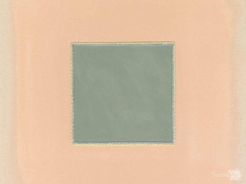 Minimalist light peach-pink and sage green geometric squares painting with simple textured lines created with embroidery (no embroidery present in the print itself). Inspired by the warm soft glow of the sun in winter and the subtle colors of nature.