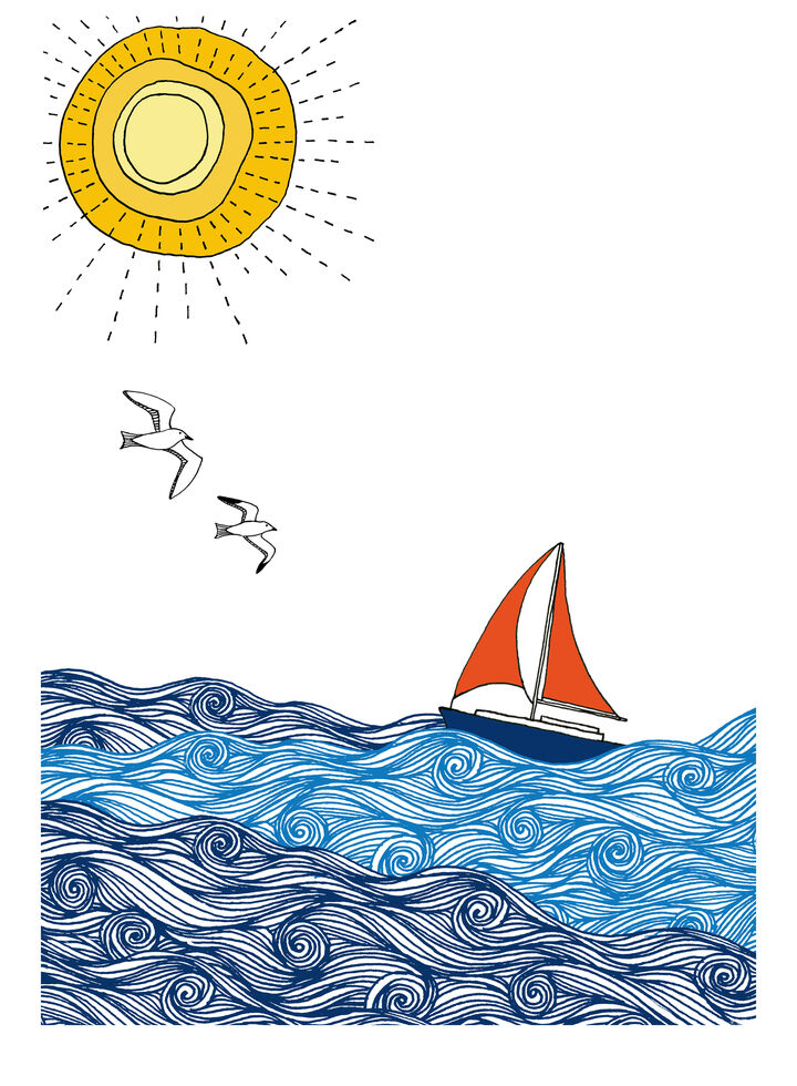 Riding out upon the high seas … a peaceful sunny scene of pattern and motion. Gulls flying, the sun beaming while this simple sailboat rocks along a rolling sea.