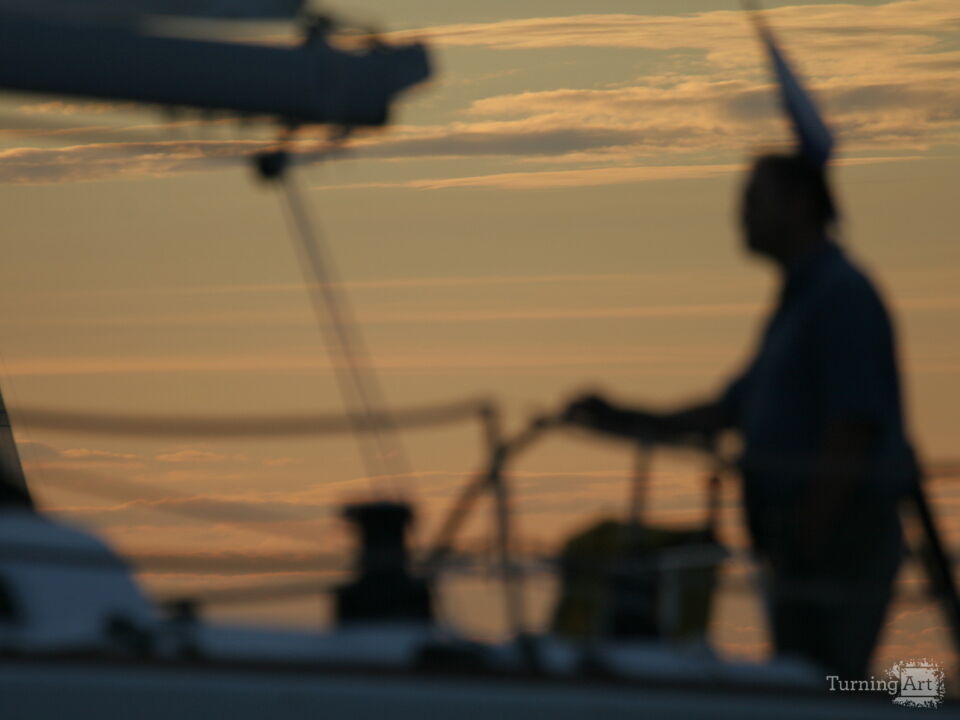 Silhouetted against warm evening light, a sailor moves across the deck as rigging and sails frame the glowing horizon. The photograph captures a quiet moment of work and motion at sea during golden hour.
