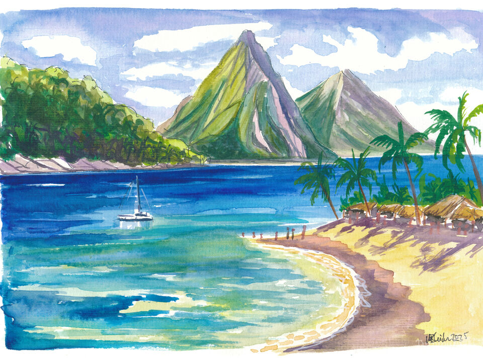 Saint Lucia Pitons Rising Over Tranquil Bay Beach