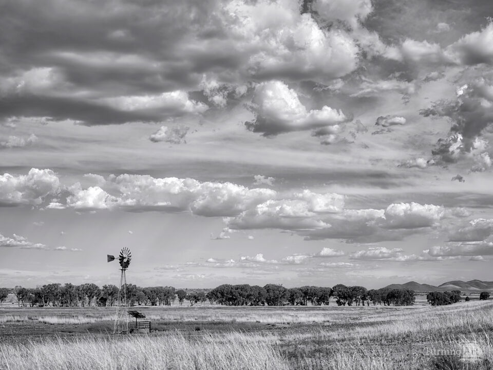 Windmill close to the Santa Cruz River tree lined bed in the San Rafael Valley in Southern Arizona. An idyllic scene of the American Southwest in one of the most beautiful valleys in all of Arizona.