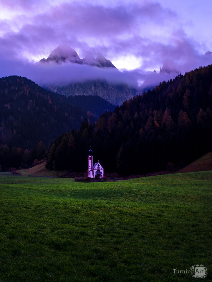In a quiet valley of the Dolomites, Chiesetta di San Giovanni, or the Chapel of St. John, stands alone. Its white walls and dark onion dome are set against a shadowy forest. The mountains loom behind, their peaks lost in the clouds. The muted purples and blues in the sky engender a dreamlike quality to the photograph.