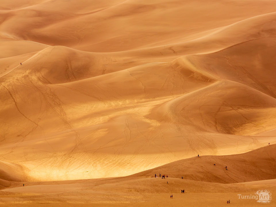 The Great Sand Dunes National Park in Colorado is a stunning landscape of contrasts and curves. The sand dunes, sculpted by wind and water, rise up to 750 feet above the valley floor, creating a dramatic backdrop for the blue sky. The dunes are not only beautiful, but also sensual, inviting the viewer to explore their shapes and textures. In this image, I hope I captured the essence of the dunes' sensuality, using the sunlight to create shadows and highlights that accentuate their curves. The tiny people on the sand provide a sense of scale and perspective, showing how vast and majestic the dunes are.