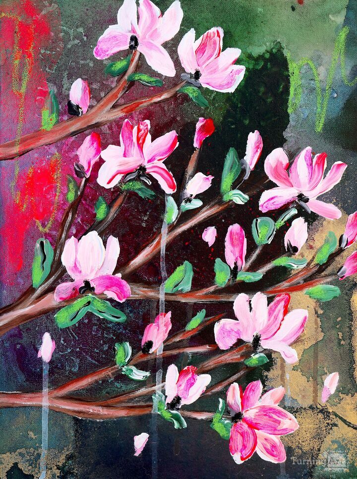 This vibrant artwork beautifully captures a cluster of blossoming flowers on a set of branches, standing out dramatically against a richly textured background. The flowers, depicted in striking pink hues with hints of white, exude an air of freshness and vitality. Their delicate petals and verdant leaves are painted with precision, showcasing the artist’s adeptness at detailing. The background is a harmonious blend of deep greens, subtle reds, and earthy browns, adding depth and contrast, which enhances the vividness of the blossoms. The composition skillfully balances natural beauty with bold use of colors, creating an immersive visual experience. Splashes and drips add dynamic energy, suggesting movement and the passage of time, while the overall aesthetic invites viewers to experience a serene yet lively moment in nature. This piece is a testament to the beauty of flora and the artist’s innovative expression.