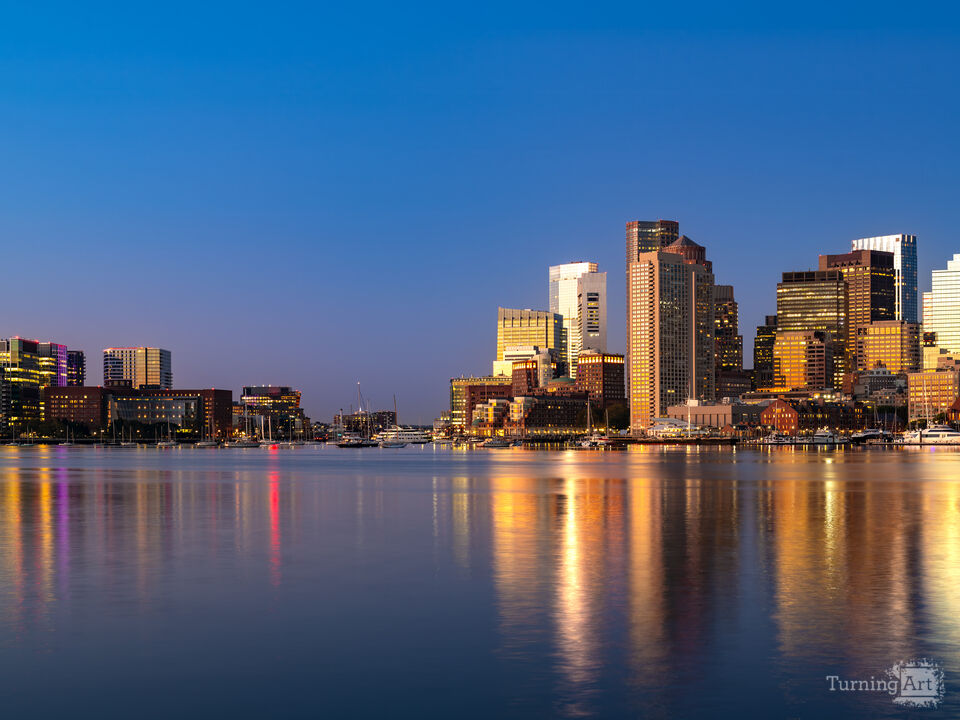 The modern architecture of the Seaport District stands alongside the historic Boston financial center at dawn.
