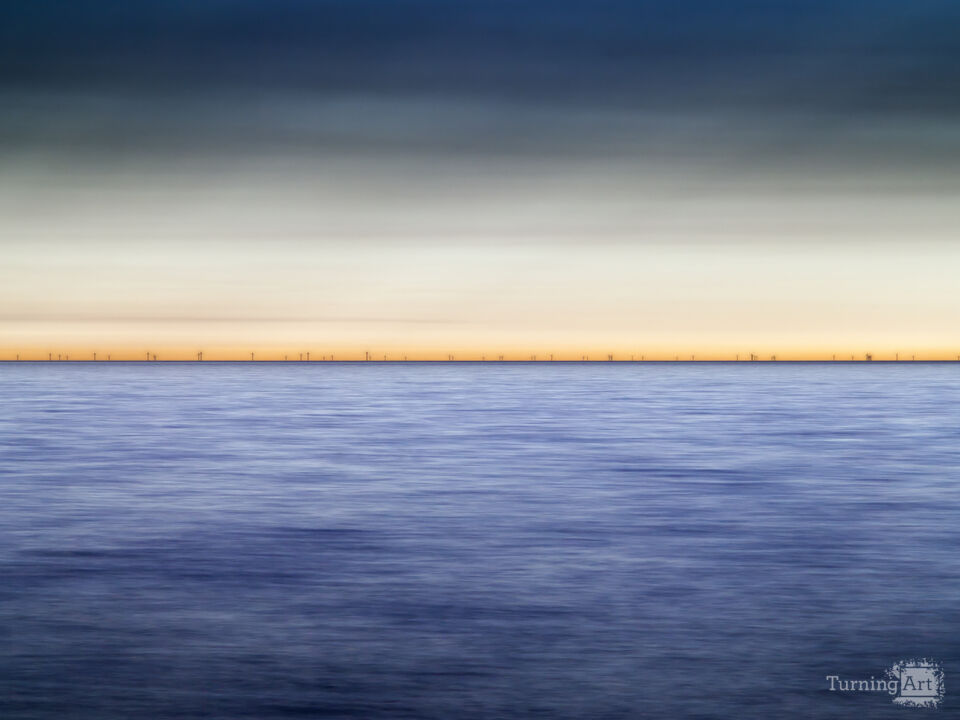 The meditative view across an empty calm sea just after sunset. At the horizon is a wind park with several wind turbines.