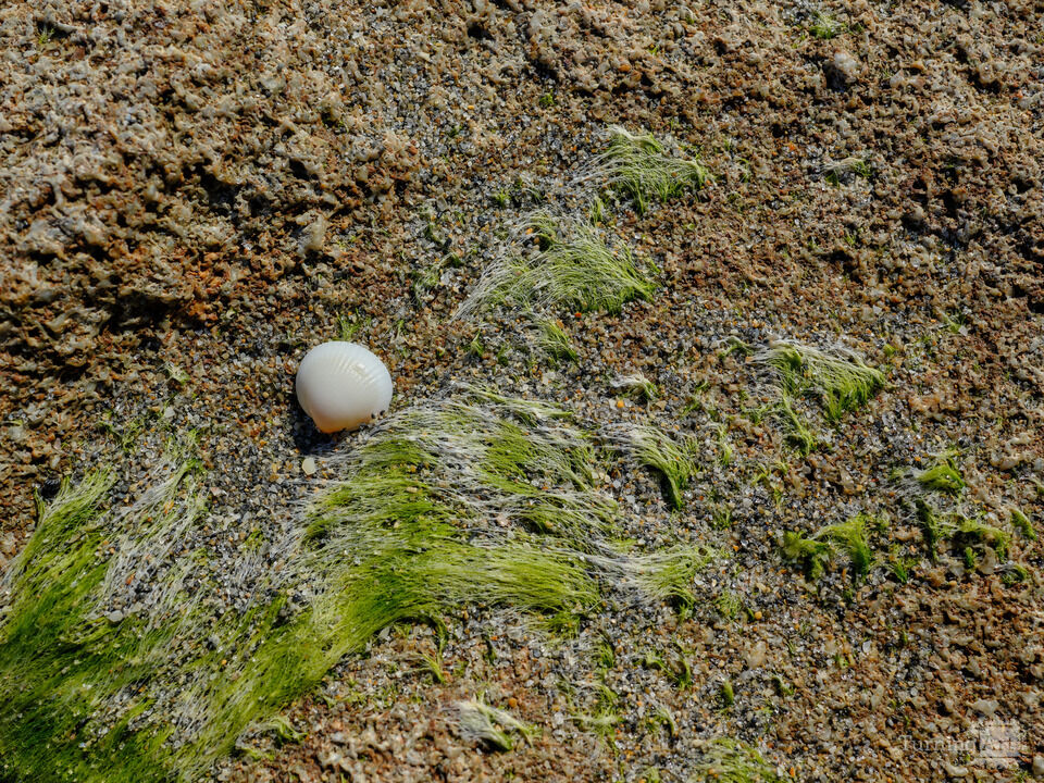 A lone seashell lays amid seaweed on the coral on Jupiter Beach Florida