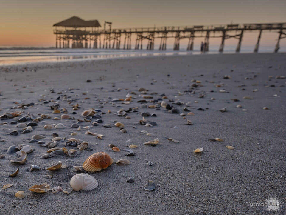 Shells at the Cocoa Beach Pier in Florida at sunrise during low tide