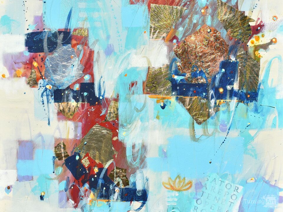 Season of Becoming is a meditation on transformation, possibility, and the boundless nature of existence. Geometric forms and layered collage intersect with gold leaf, weaving together references to mindfulness, astrophysics, microbiology, and space-time, reflecting how we perceive and shape reality.