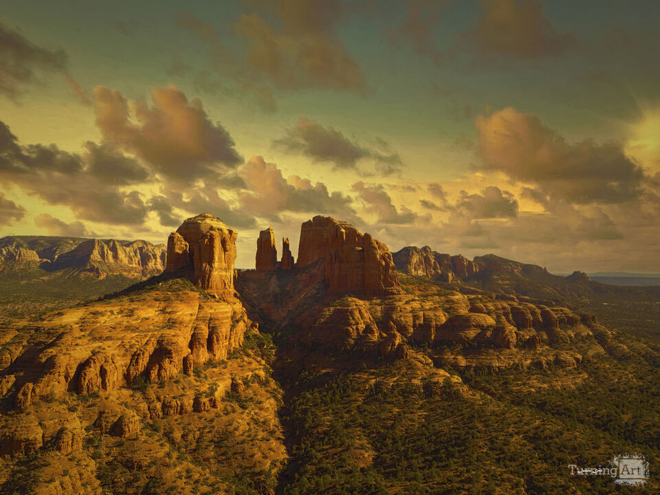 An rare aerial view of the famous Cathedral Rock in Sedona, Arizona. Taken from an air balloon it offers a rarely seen view of the inside of Cathedral Rock.