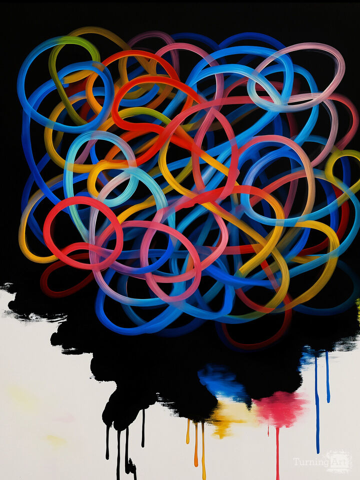In this painting, I poured my energy into a vibrant tangle of colors, symbolizing the complexity of emotions and thoughts. I wanted to capture the dynamic chaos beneath calm surfaces, blending expressionism’s raw feeling with pop art’s boldness. The loops pulse with life, while the drips hint at fleeting vulnerability. Imagine this artwork igniting your space with vibrant movement and emotional depth.