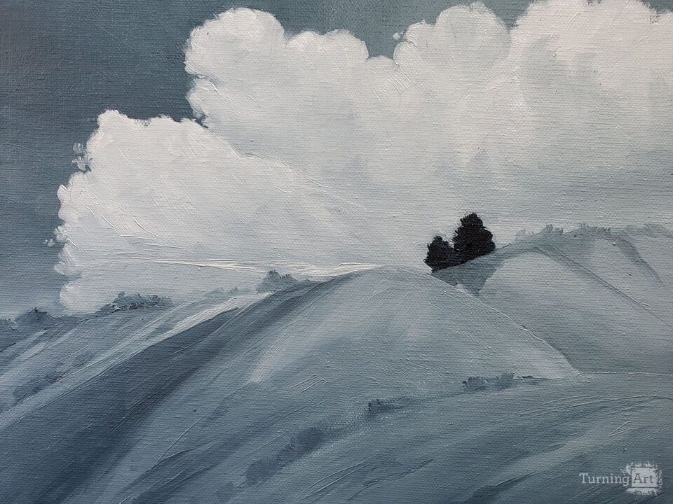 I painted this series of three Sentinel paintings over a period of time, from my imagination. I love skies and clouds, and wanted to create a dramatic view of rising cumulus clouds coming up behind a high hill or mountain. They are so uplifting and impressive, and I hoped to portray that feeling in these oil paintings.