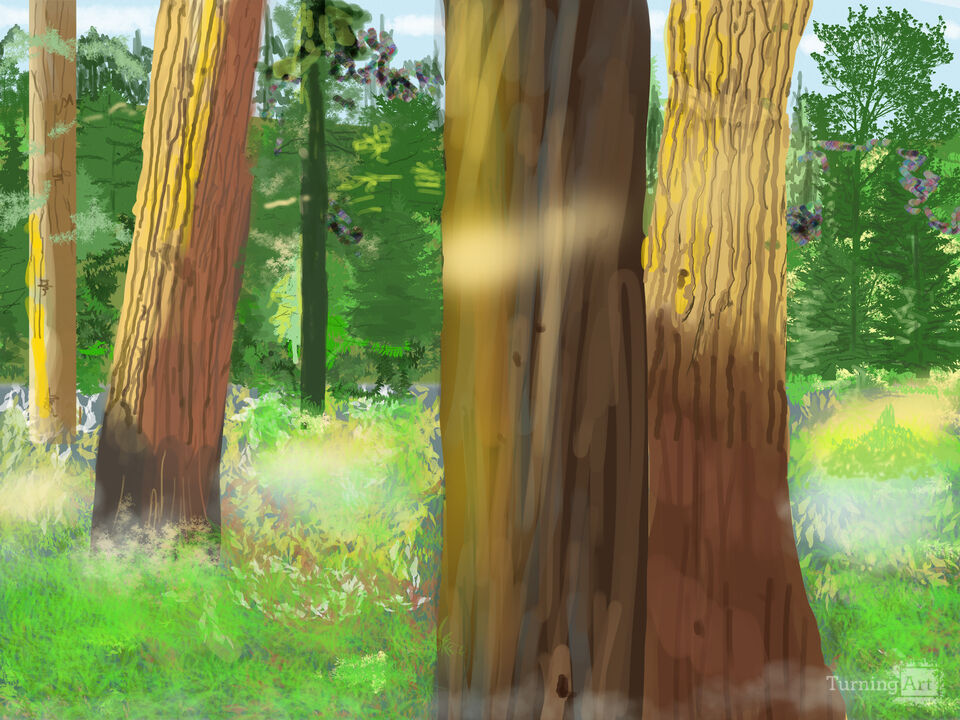 This digital painting presents a convincing and tranquil portrayal of a woodland environment, effectively immersing the viewer in the serenity of nature. The tall sequoia trees in the foreground serve as strong vertical anchors, guiding the eye upward and creating a sense of grandeur within the scene. Attention to the texture and coloration of the bark—using a range of browns and yellows—gives the trunks an organic and tactile quality, adding both naturalism and visual interest. The choice to emphasize these variations really helps bring the forest alive, offering a reminder of nature’s complexity and beauty.