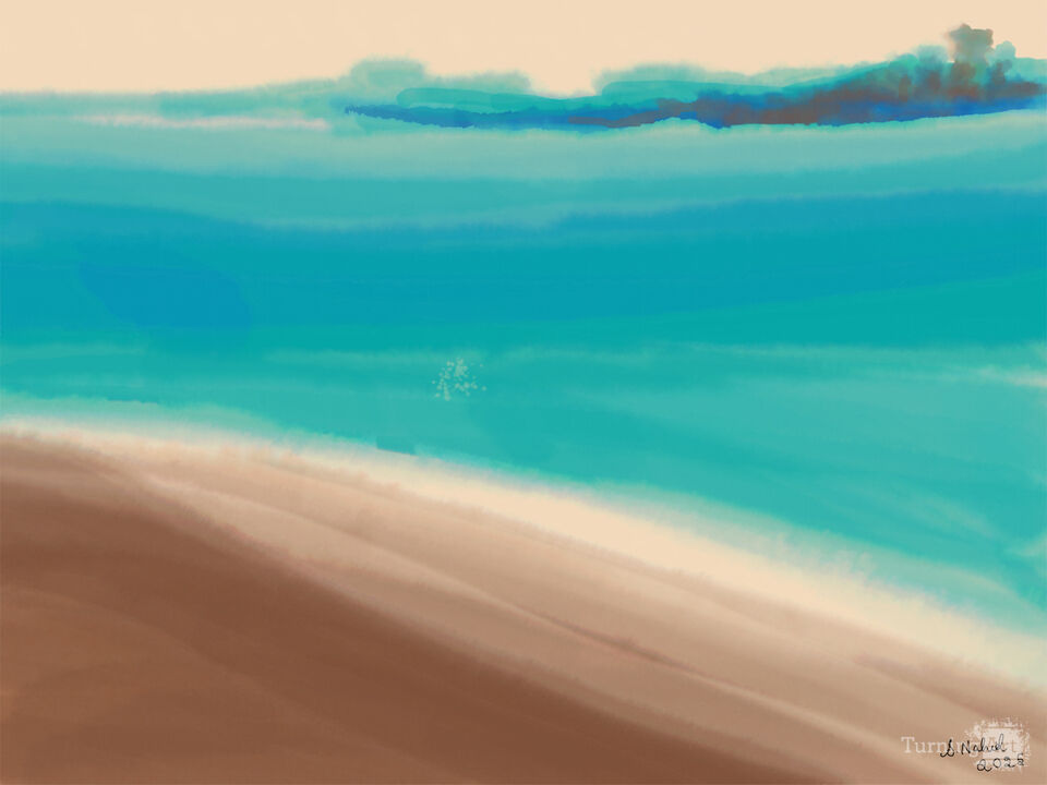 This piece capture the serene meeting of land, sea and sky inviting the viewers into a dream like shoreline. The distant haze on the horizon evokes a sense of depth and peaceful distance, encouraging slow contemplation. This composition is designed to create a moment of calm offering a visual pause that feels both grounding and expansive.