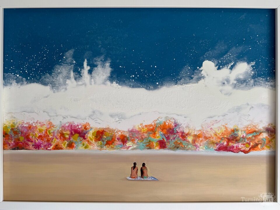 Acrylic, oil and collage on panel with a white wooden frame, 72×52×2cm and ready to hang.