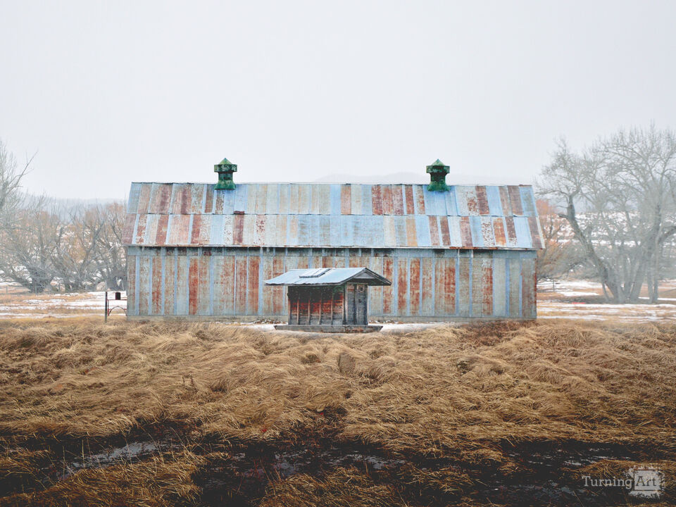 The weathered metal sheets that cover this old sheep barn are a beautifully aged patchwork of colors, and on this foggy fall day they seem to float in an atmosphere suspended in time. On a day when the grasses, sky and trees all lie dormant, this little barn seems to keep the time until nature returns with color the following Spring, many months into the future from when I took this photograph. I do love the absolute stillness of days like this, when one season transitions into another.