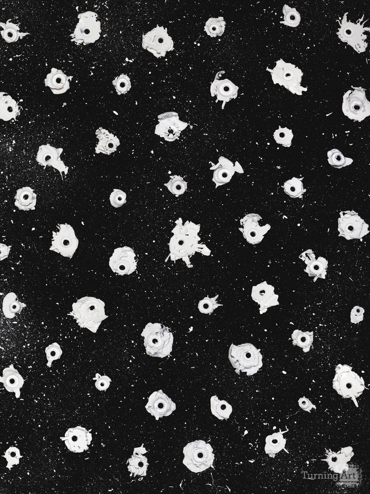This is a print of a portion of an original artwork (Tears of America), which was the focal point for Carina's 2020 Humanity Collection. Created as a result of the March 2020 protests in response to the killings of George Floyd and Breonna Taylor, and other incidents of police brutality, Carina wanted to create a piece to memorialize not only the more recent and well-known victims, but also those that spanned across different years. The piece was designed to be rich with symbolism. The piece is monochromatic, which was designed to pull away from the colors of the flag that we typically associate with joyful holidays and the Americana design. The 50 stars have been replaced by representations of bullet holes, comprised of dried paint bits.