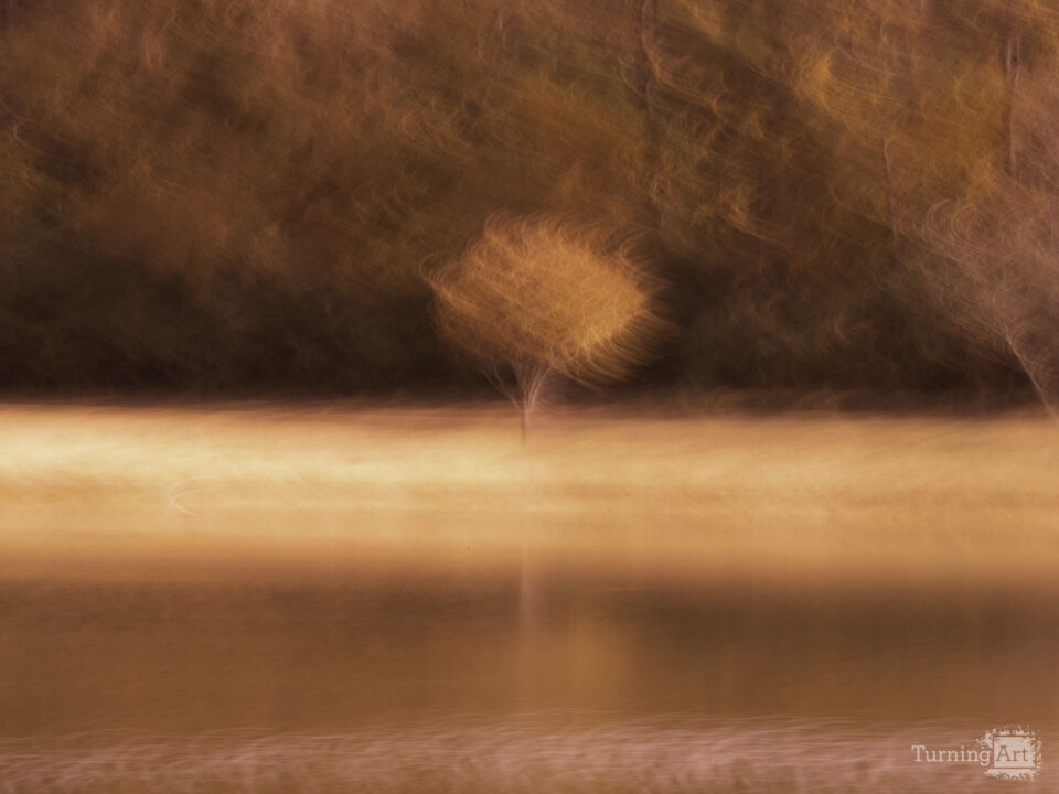 I captured this image on a crisp autumn day in the Tennessee countryside while standing next to a still lake. I was inspired by a singular tree standing against a backdrop of pines. By transforming the original green hues, I reimagined the scene and created this abstract landscape series with vibrant palettes of amber, fuchsia, and violet.