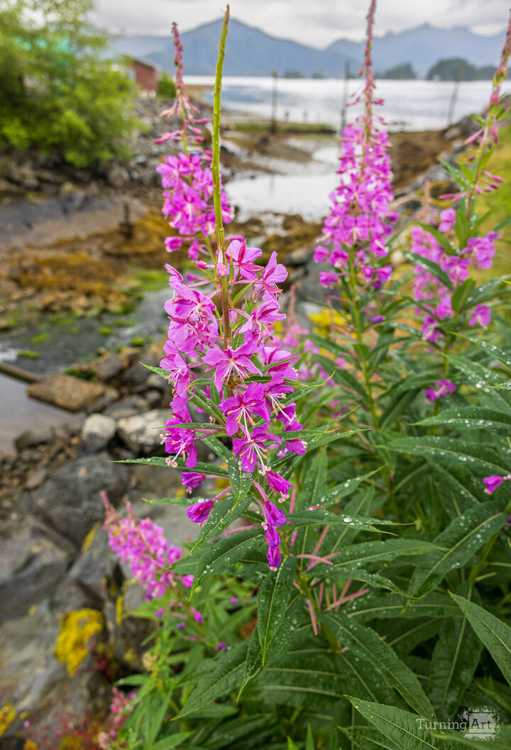Vibrant pink flowers from the Alaskan native fireweed stand tall beside a nearby Sitka stream. Their petals are adorned with droplets from recent rain. The background features a rustic landscape with distant mountains under a cloudy sky, contrasting with the striking colors of the blossoms. The natural setting evokes a sense of serenity and freshness.