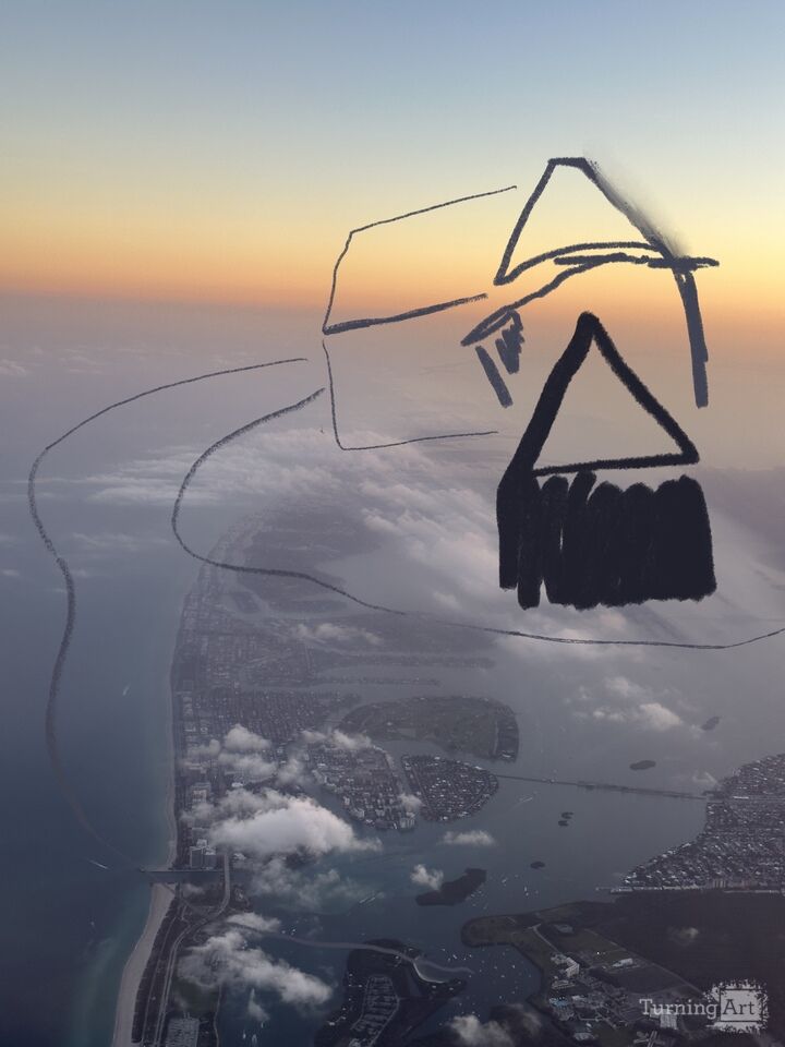 This is a part of a series of digital drawings I created using a selection of photographs I took on various flights. I always choose a window seat because I enjoy the daydreamy experience of looking out, and I never know if a particular vantage will be inspirational. Back in the studio, I imported the photograph into Procreate on the iPad, using an Apple Pencil for its pressure sensitivity to draw on it. In Sky City Six, delicate, thin, wobbly lines are inspired by Whistler’s drawings and etchings. Their softness makes them feel as though they belong with the clouds, ephemeral. On my return flights, I anticipate returning home. In this case, it is Miami Beach below. The houses are like mindscapes, projections of what I’m thinking.