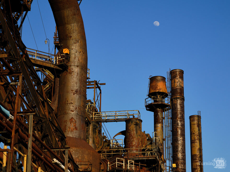 Peeling paint and rust at sunset over the Bethlehem Steelworks smoke stacks with a moonrise over the stacks