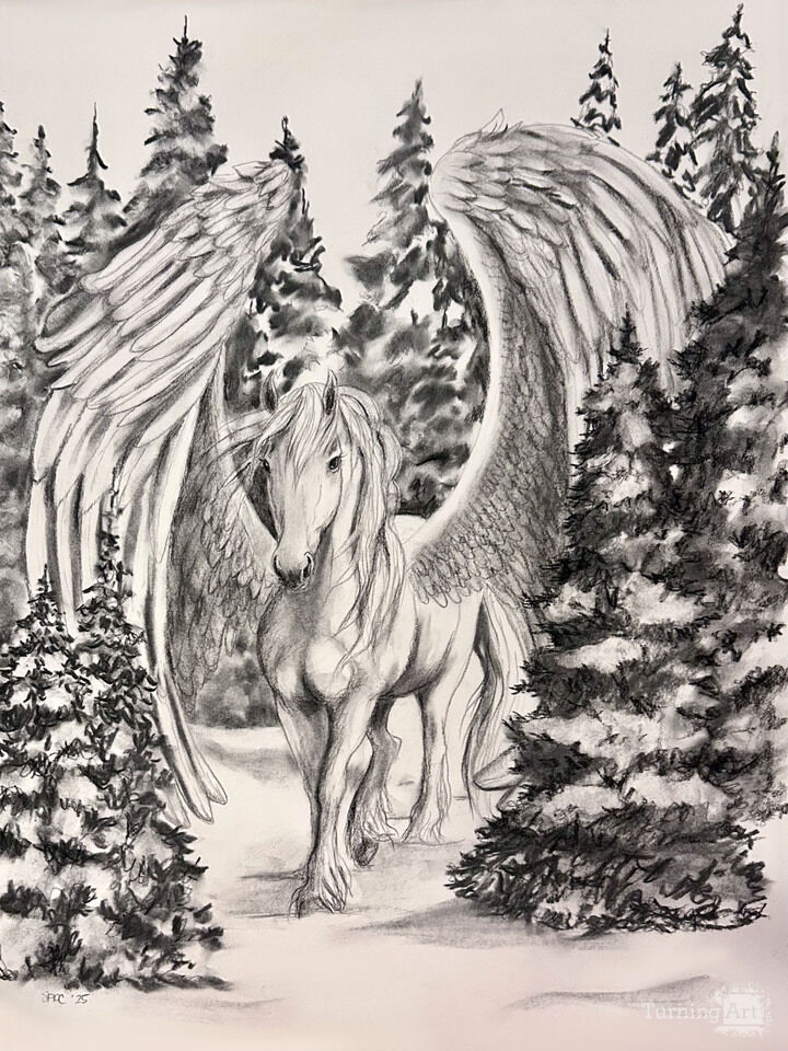 This charcoal drawing captures the quiet wonder of winter as a majestic winged horse, an ethereal snow angel, steps gracefully through a forest of towering evergreens. Soft shadows and delicate textures bring the creature to life, its wings unfolding like a protective embrace against the cold landscape. Sometimes you need a touch of magic in your life, and in this serene snowy world, that magic appears just when you need it most.