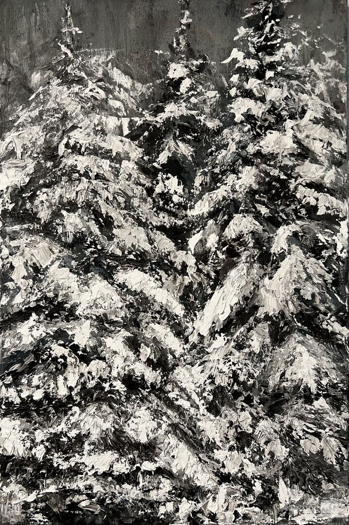 In this oil painting, I've captured the serene yet invigorating essence of winter. The expressive brushstrokes and monochrome palette evoke the crisp, chilling atmosphere of a forest cloaked in snow, while the abstract approach beckons viewers to immerse themselves in the textures and the dance between light and shadow. This piece symbolizes nature's quiet resilience, offering a sense of peace and contemplation to envelop your space with wintertide's tranquility.