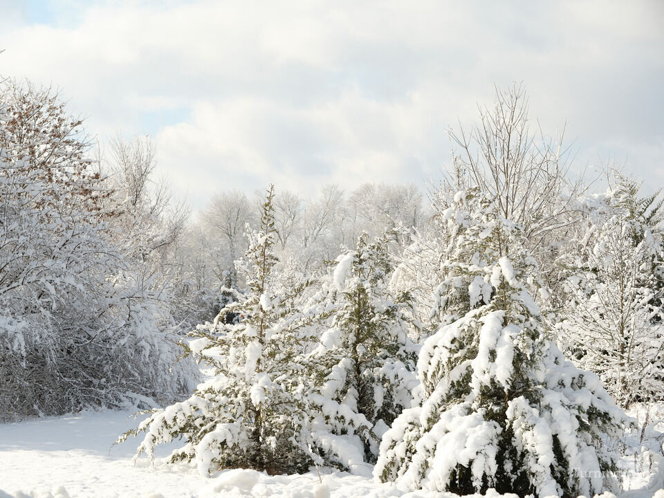 Snowy path around snow covered pine trees in the Pine Barrens of Southern New Jersey on a frosty snowy morning