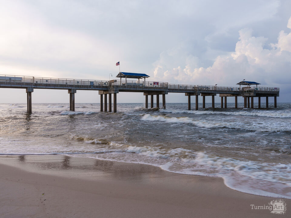 Soft Gulf waves roll gently onto the sandy shoreline during a calm early morning in Orange Beach, Alabama, USA. The soft colors of sunrise have quietly faded, leaving behind a soothing wash of pale blues across the sky and water. A private fishing pier extends into the calm Gulf, creating a sense of depth and guiding the eye toward the peaceful horizon.