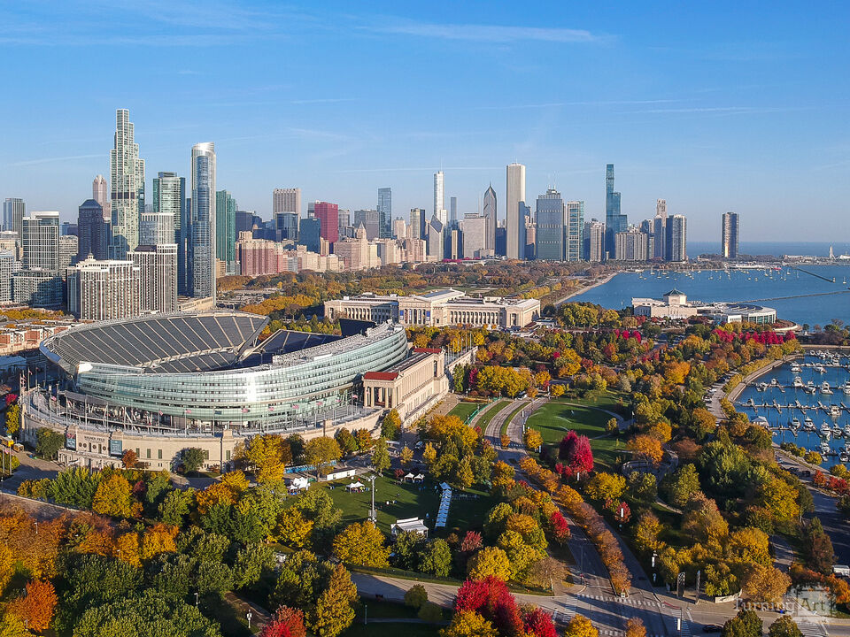 Chicago's Soldier Field and skyline on a beautiful autumn morning.