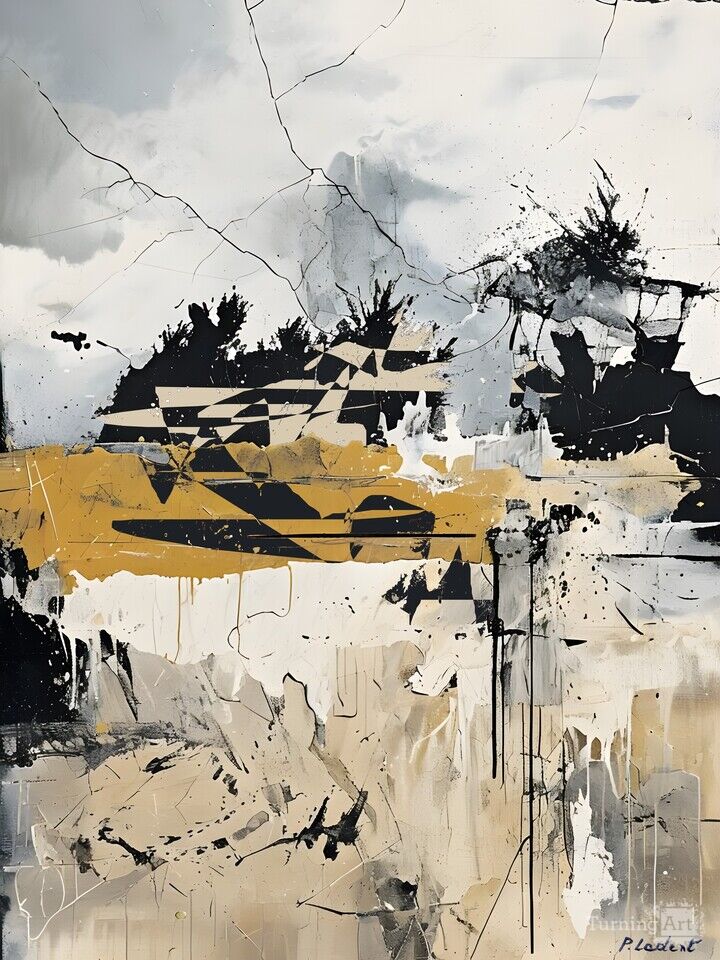 This striking painting uses a bold play of color contrasts to create a mysterious and captivating mood. The canvas is dominated by deep black hues, cut by bursts of bright white and touches of ochre yellow that add an intriguing depth. The erratic lines running through the composition evoke abstract elements that could recall natural formations or imaginary landscapes. The center of the work, marked by rough textures and energetic strokes, draws the eye to an enigmatic focal point. The balance between smooth and textured sections emphasizes a tension between apparent chaos and subtle harmony. This piece invites the viewer to explore a complex and stimulating inner universe, typical of the artist, where every detail tells a story beyond the visible surface.