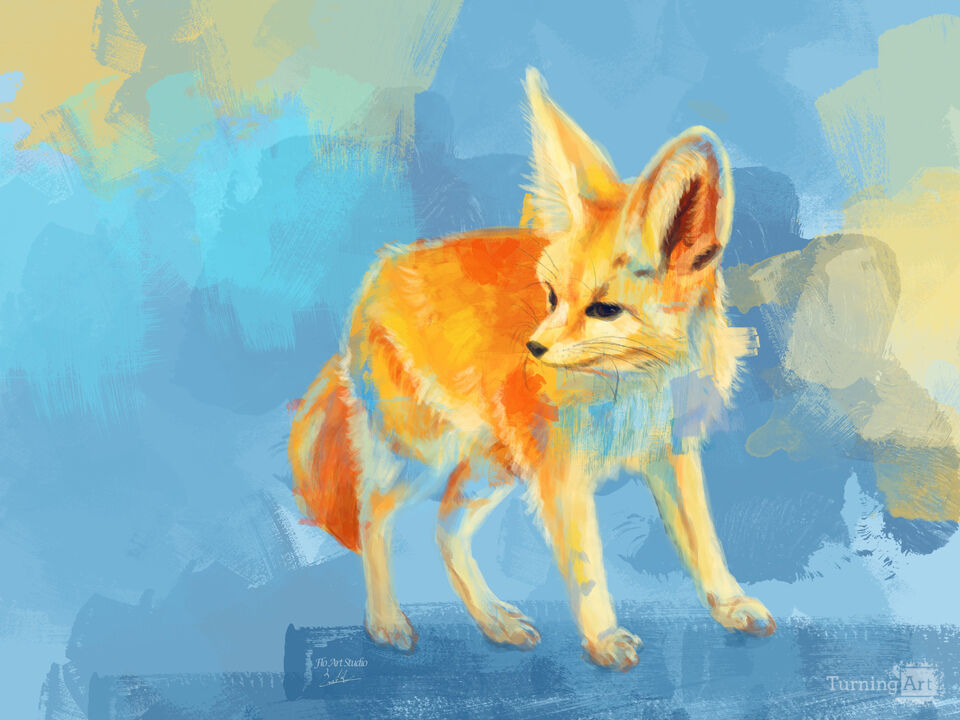 Colorful digital painting of a fennec fox, blending earthy desert tones with splashes of color. Its large ears and soft, sandy fur glow in warm shades of yellow, tan, and orange, echoing the hues of the desert landscape it calls home. Set against an abstract blue background, the contrast emphasizes the fox’s natural beauty.