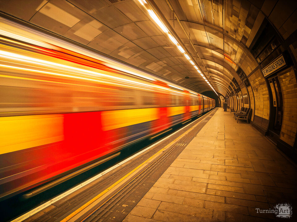 A train rushes through a dimly lit subway station, leaving streaks of light in its wake. The tunnel's curvature and lighting create a dynamic sense of motion. Created with AI plus other digital editing in a photorealistic style.