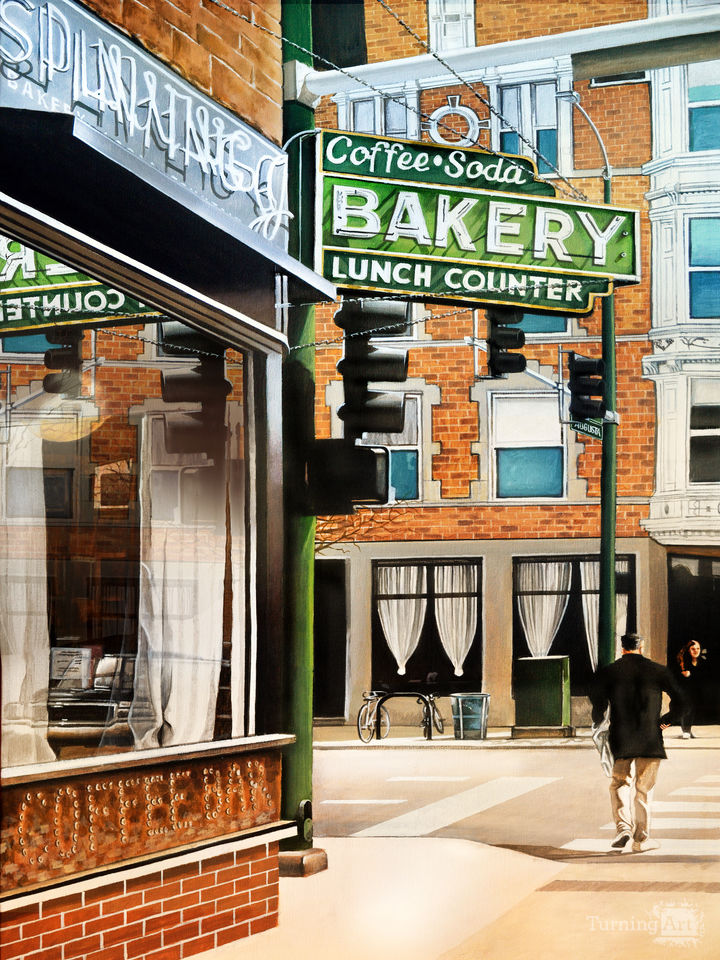 This painting was a commissioned piece I did for someone who lived by this corner. I thought that the perspective was interesting and it has a classic vintage quality to the corner bakery.