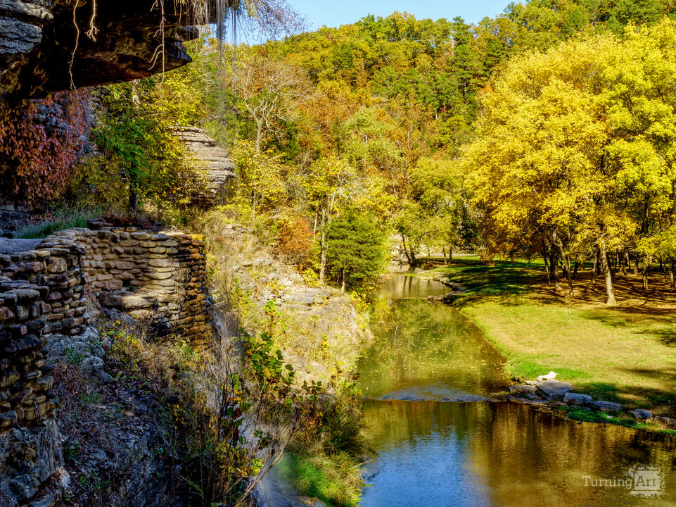 A gorgeous autumn scene in the Ozarks showcases a rugged cliff, a colorful landscape and bluff, Dogwood Creek, and a graceful waterfall you can actually walk behind. This striking spot is part of the Great Spirit Rock Shelter in Dogwood Canyon Nature Park in Lampe, Missouri, just south of Branson. The waterfall is hard to see in this scene as it blends in with the background but it flows over the rock cliff above and falls along the stone wall. Surrounded by vibrant fall foliage and rock formations, the area highlights the park’s beauty and expansive wilderness. With its many waterfalls, scenic acreage, and abundant wildlife, Dogwood Canyon is a must-visit destination for anyone exploring the Branson region.